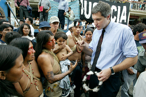 Attorney Steven Donziger talks with indigenous people from the Lago Agrio region of Ecuador. Photo by Lou Dematteis